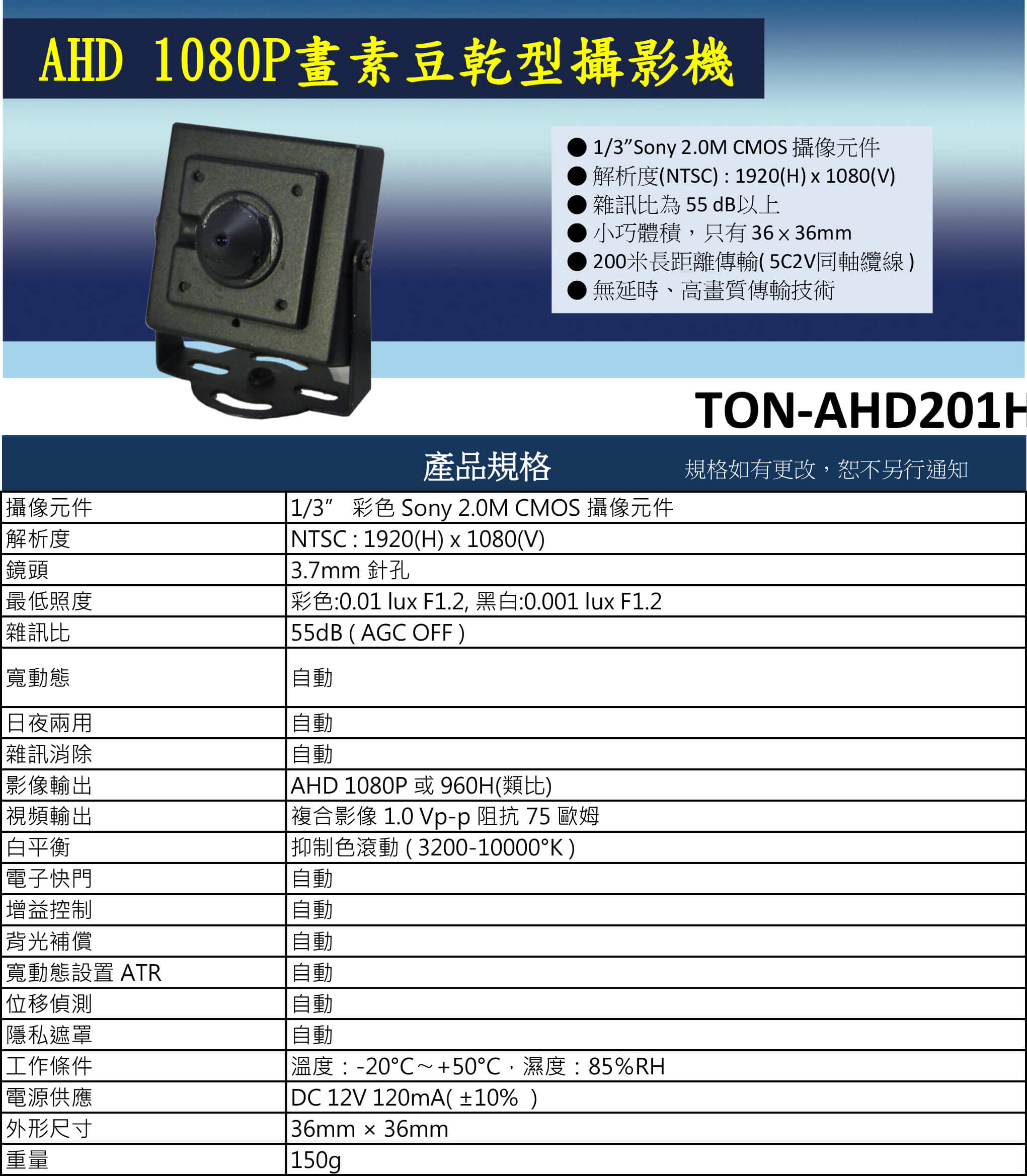 TON-AHD201H AHD 1080P畫素豆乾型攝影機 | ||