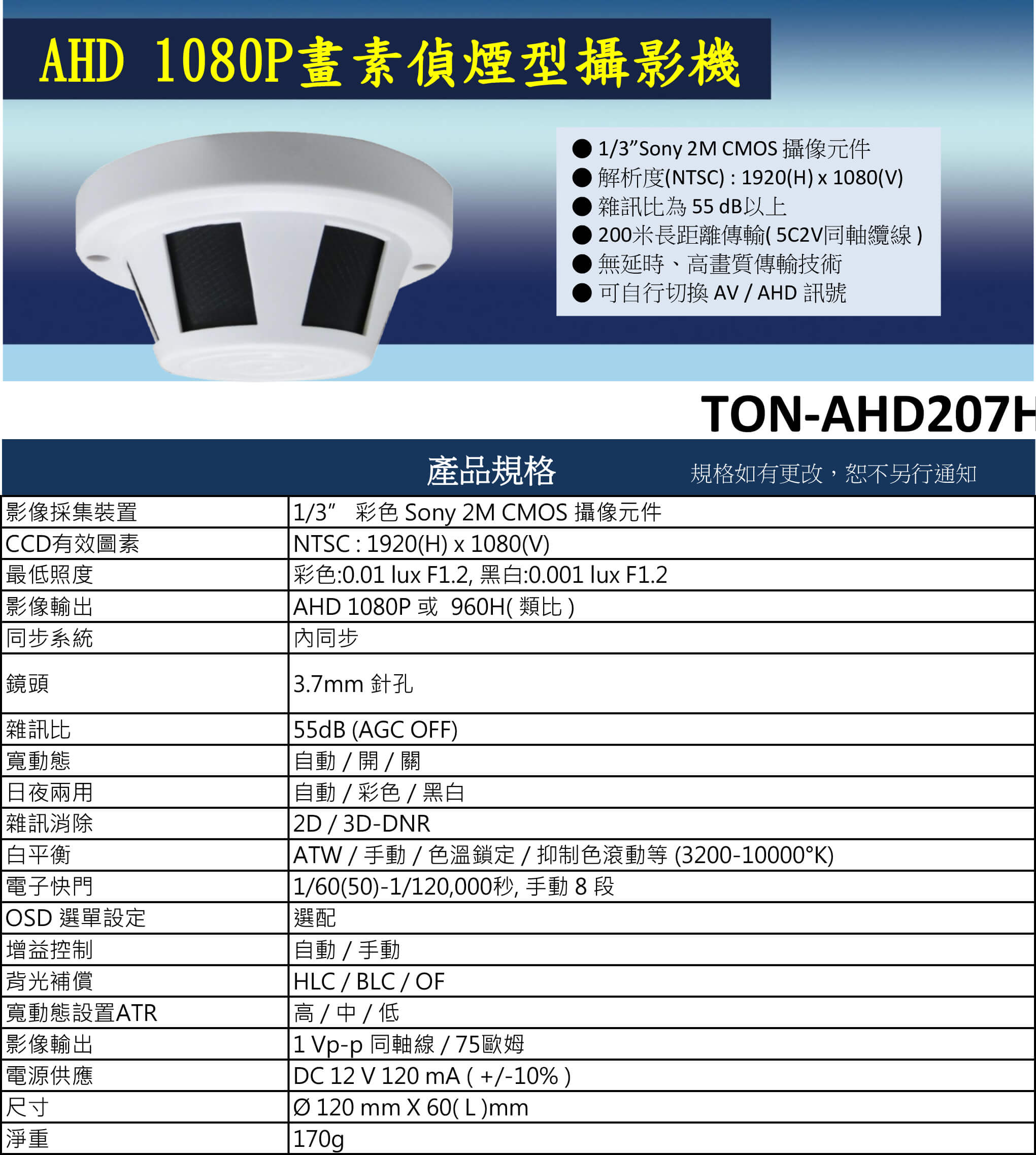 TON-AHD207H AHD 1080P畫素偵煙型攝影機 | ||