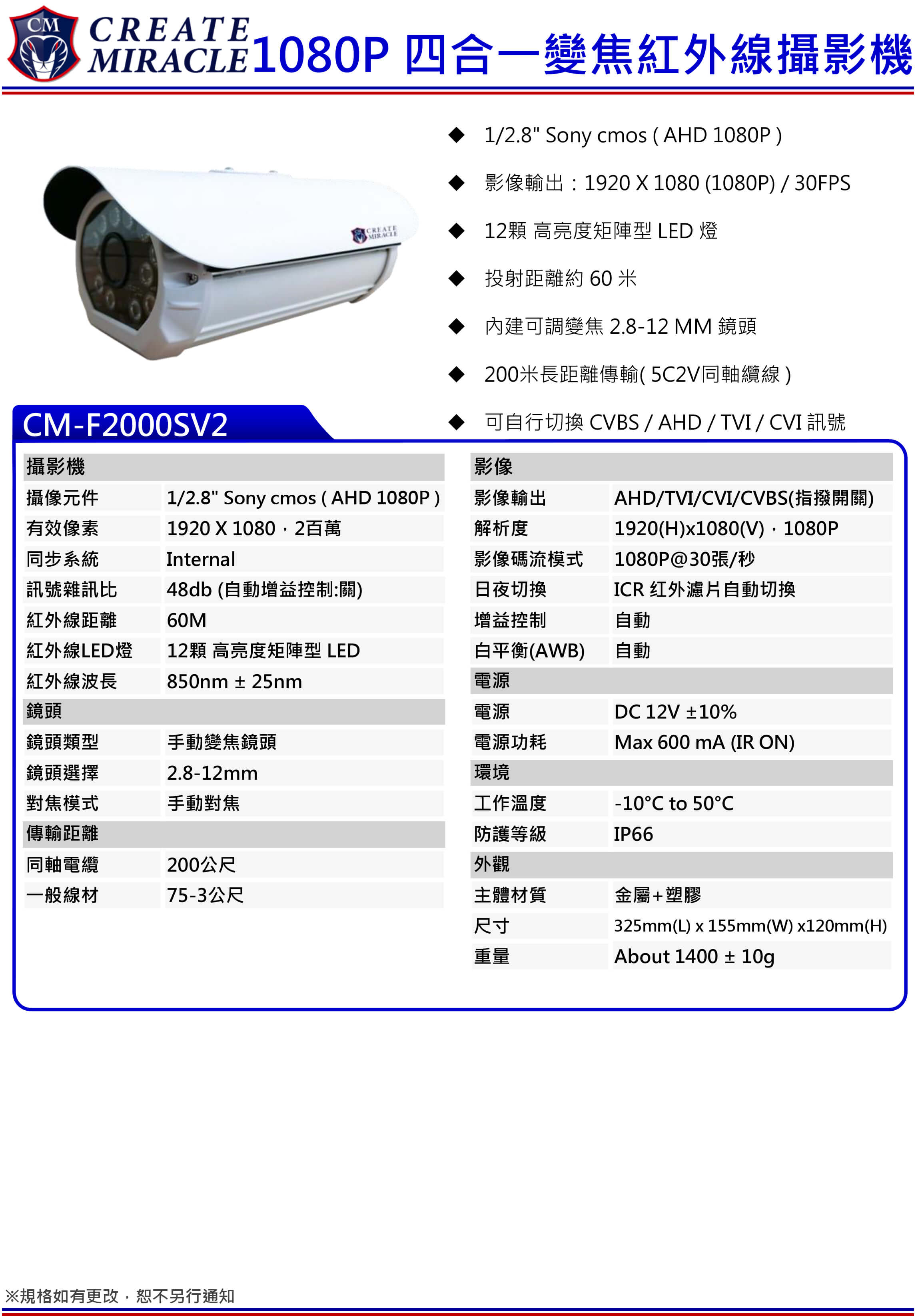 CM-F2000SV2 1080P 四合一變焦紅外線攝影機 | ||
