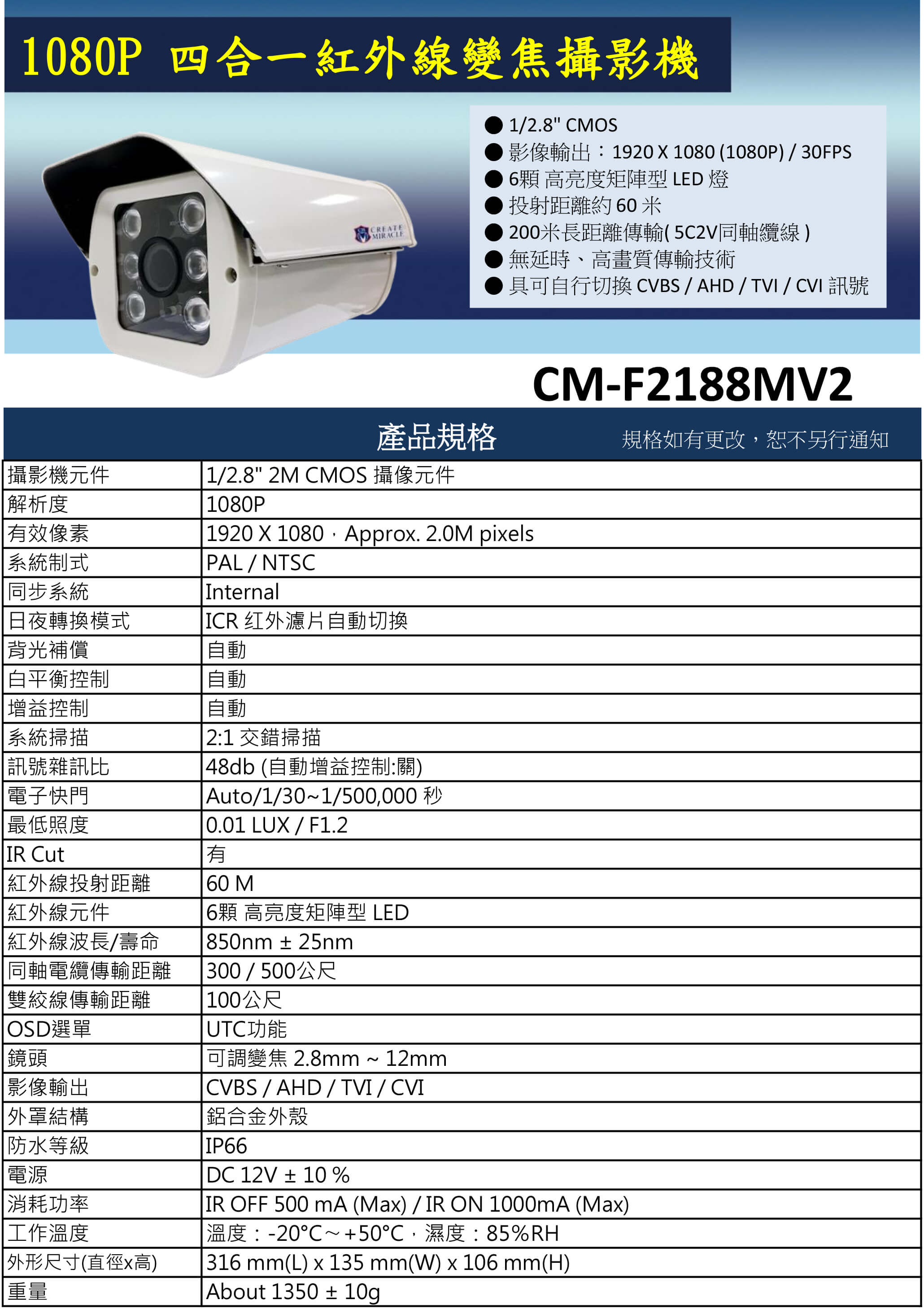 CM-F2188MV2 1080P 四合一紅外線變焦攝影機 | ||
