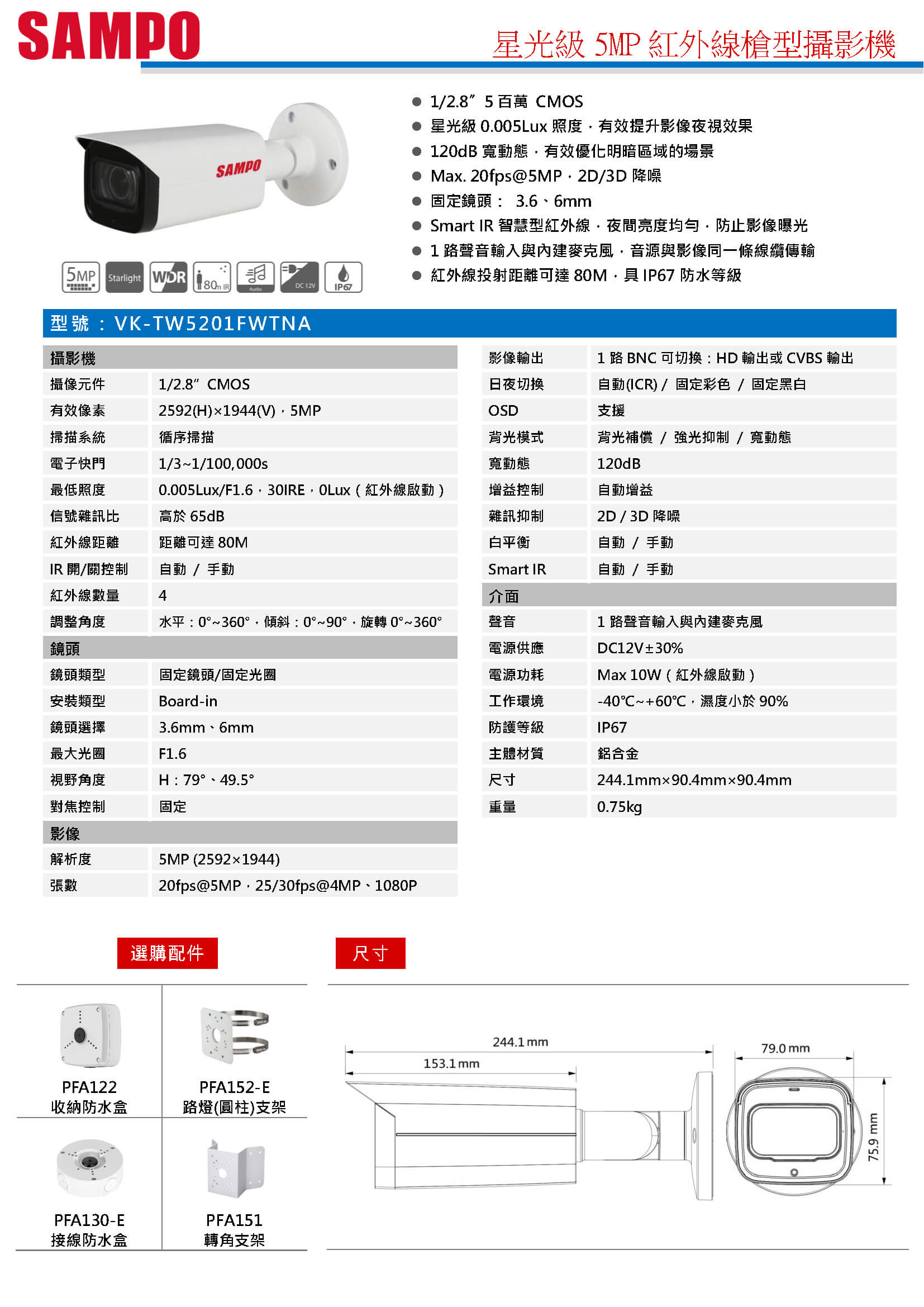 VK-TW5201FWTNA 星光級5MP紅外線槍型攝影機 | ||