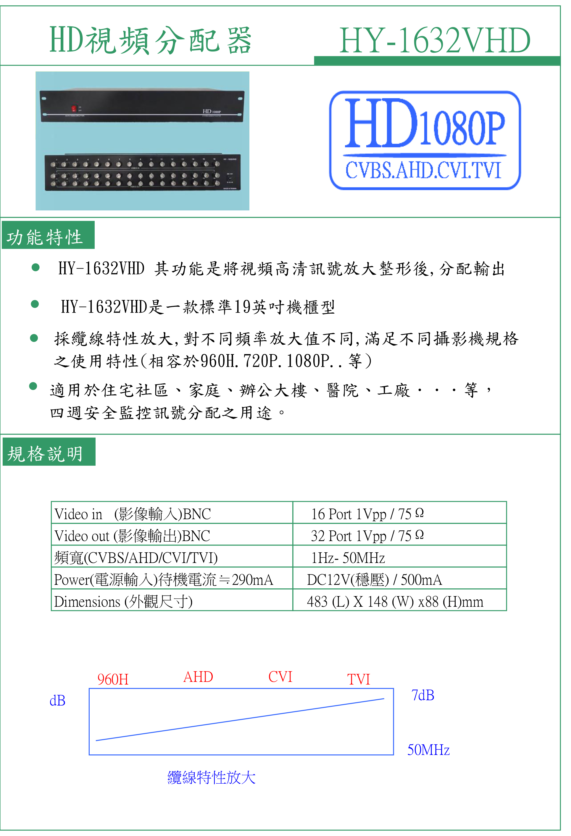 1. HY-1632VHD 其功能是將視頻高清訊號放大整形後,分配輸出